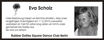 | Eva hat mit dem Square Dance 1968 bei den Havel Dancers begonnen und war seit September 1973 Mitglied bei uns. | ![]() |
